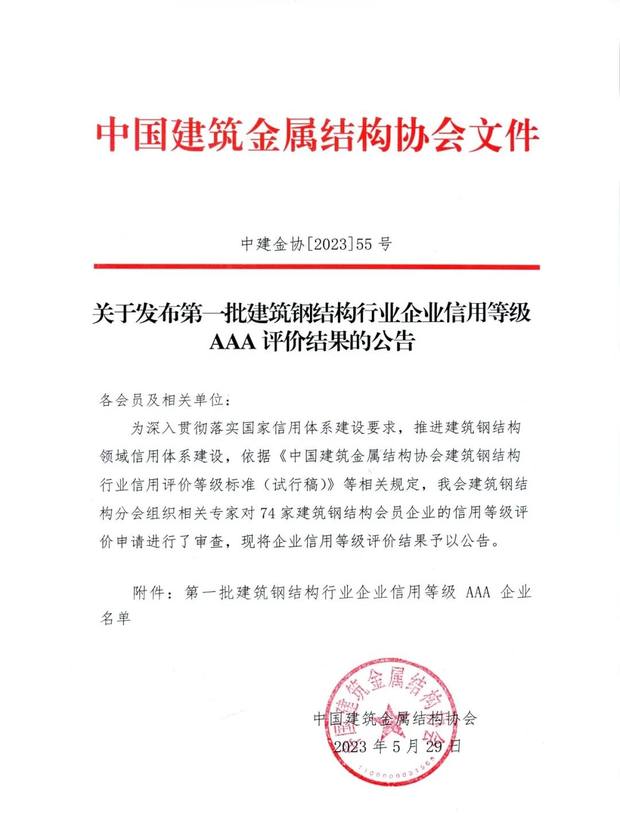 近日,中國建筑金屬結(jié)構(gòu)協(xié)會發(fā)布《關(guān)于發(fā)布第一批建筑鋼結(jié)構(gòu)行業(yè)企業(yè)信用等級AAA評價(jià)結(jié)果的公告》。安徽富煌鋼構(gòu)股份有限公司被認(rèn)定為“第一批建筑鋼結(jié)構(gòu)行業(yè)企業(yè)信用等級AAA”企業(yè)。